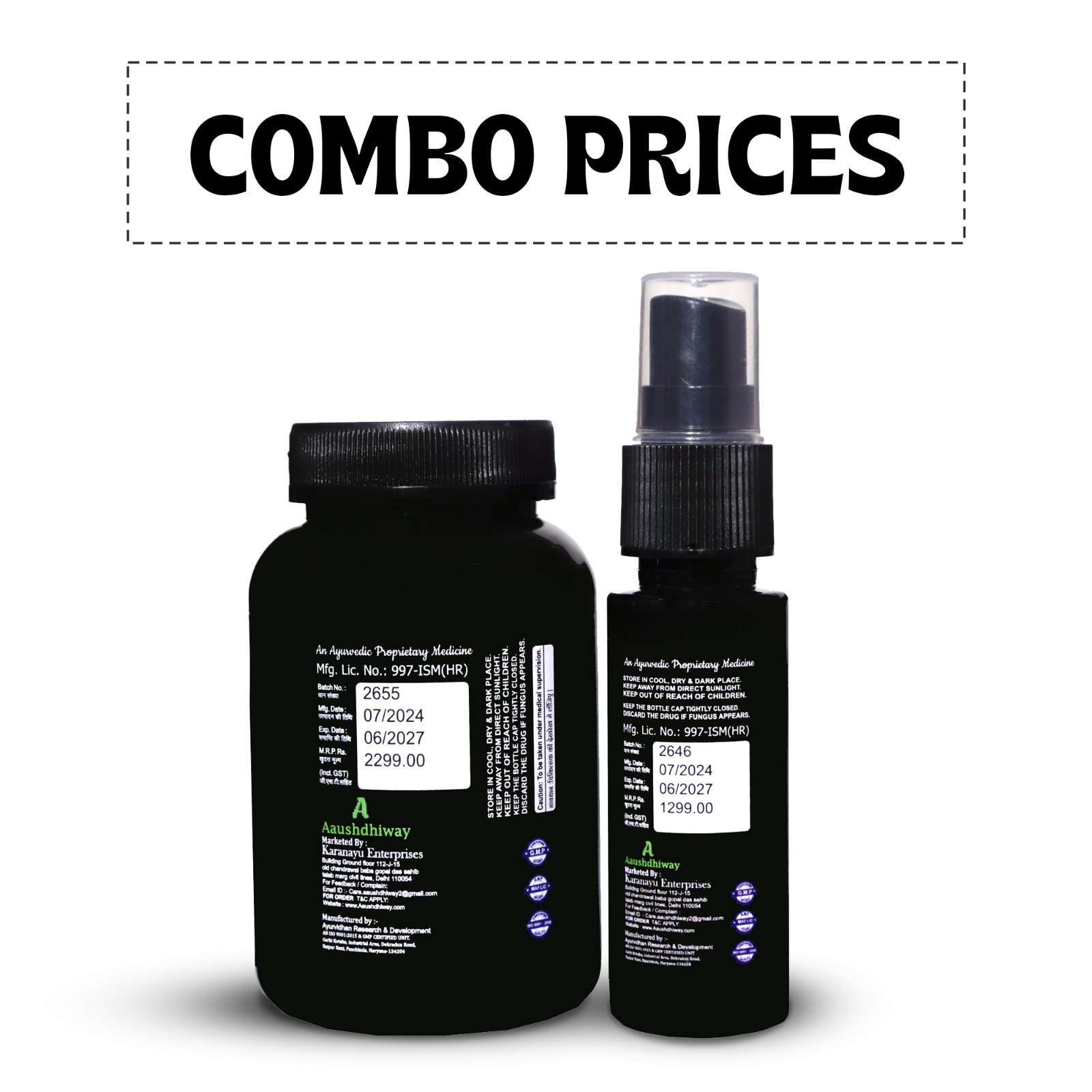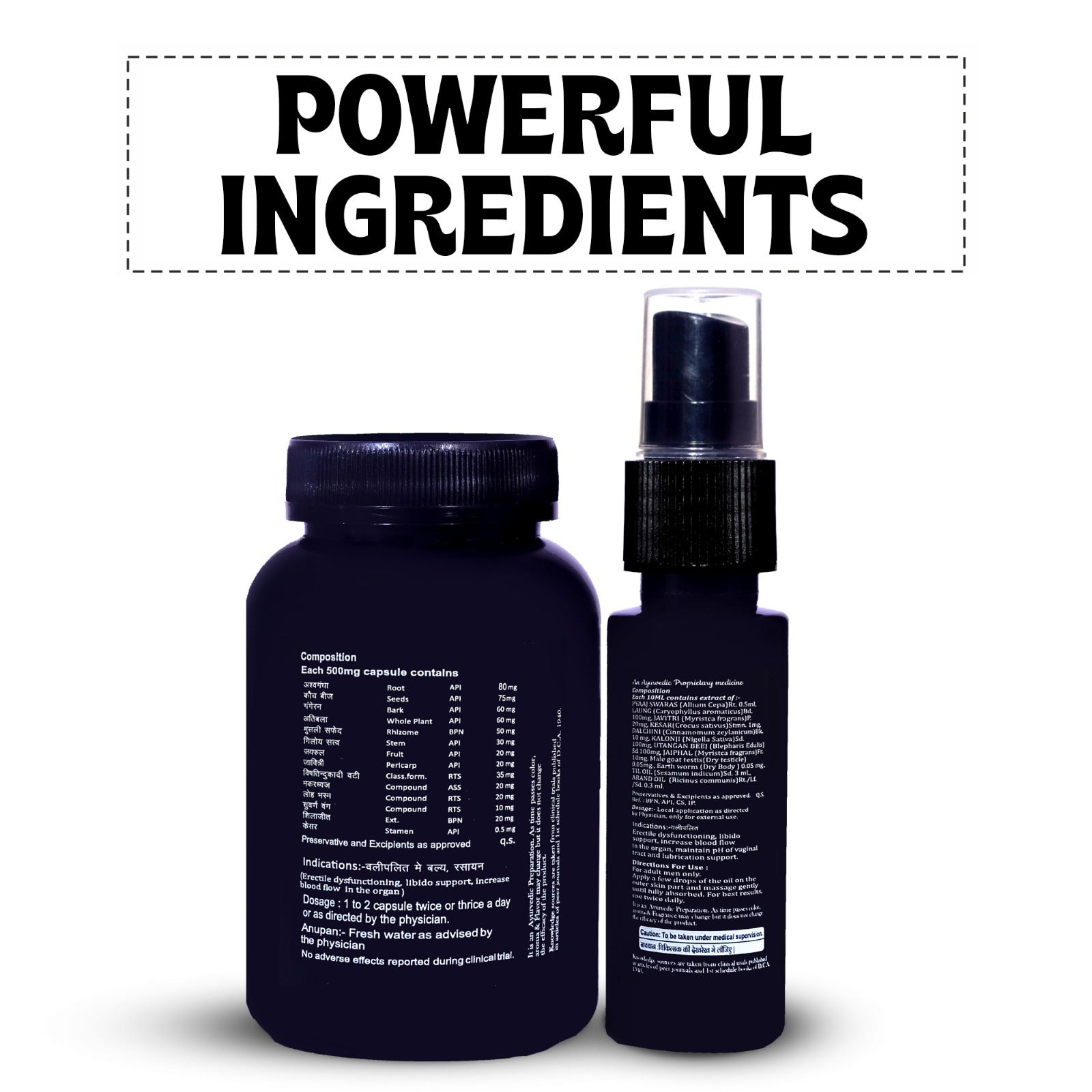 NATURAL AND POWERFULL  INGREDIENTS :-  Both products are made from natural, herbal extracts as per ancient ayurvedic practices :- Pure Shilajit, Ashwagandha, Kaunch Beej, Atibala, Safed Musli,Giloy, Vishtindukadi Vati, Loha Bhasma, Keser, Pyaaj Swaras, Loung, Kalonji, Dalchini, Javitri, Utangan Beej, Til Oil, Arand Oil, Jaiphal.